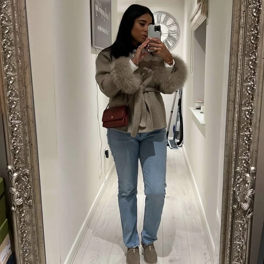 Elegant Faux Fur cropped trench coat wrap coat fall coat.