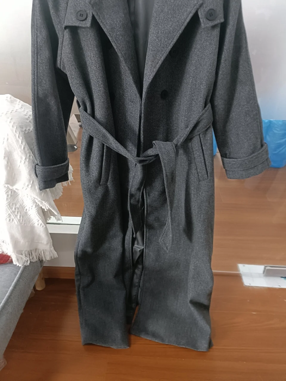Double breasted oversized long trench coat.