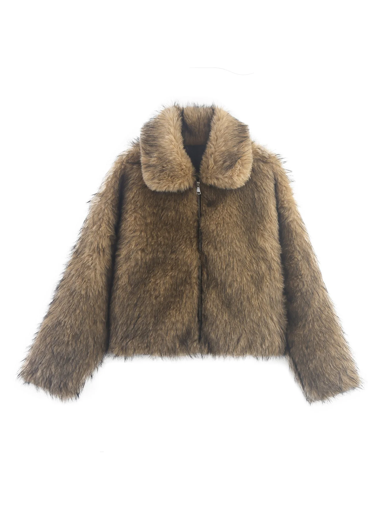 Faux fur jacket with zipper.