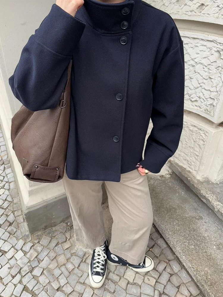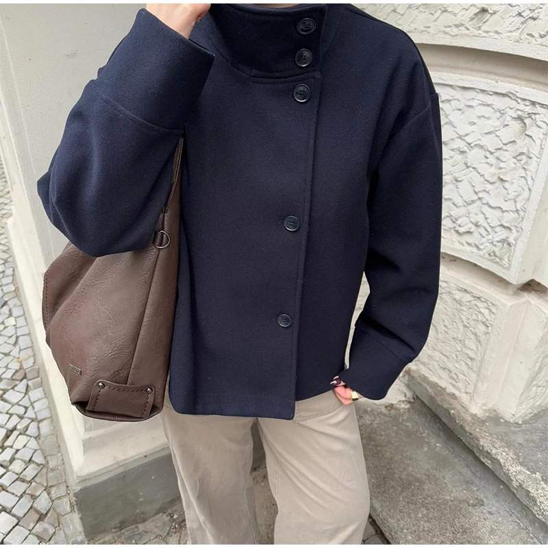 Featuring a casual stand collar and double-breasted closure, it exudes a modern streetwear vibe.