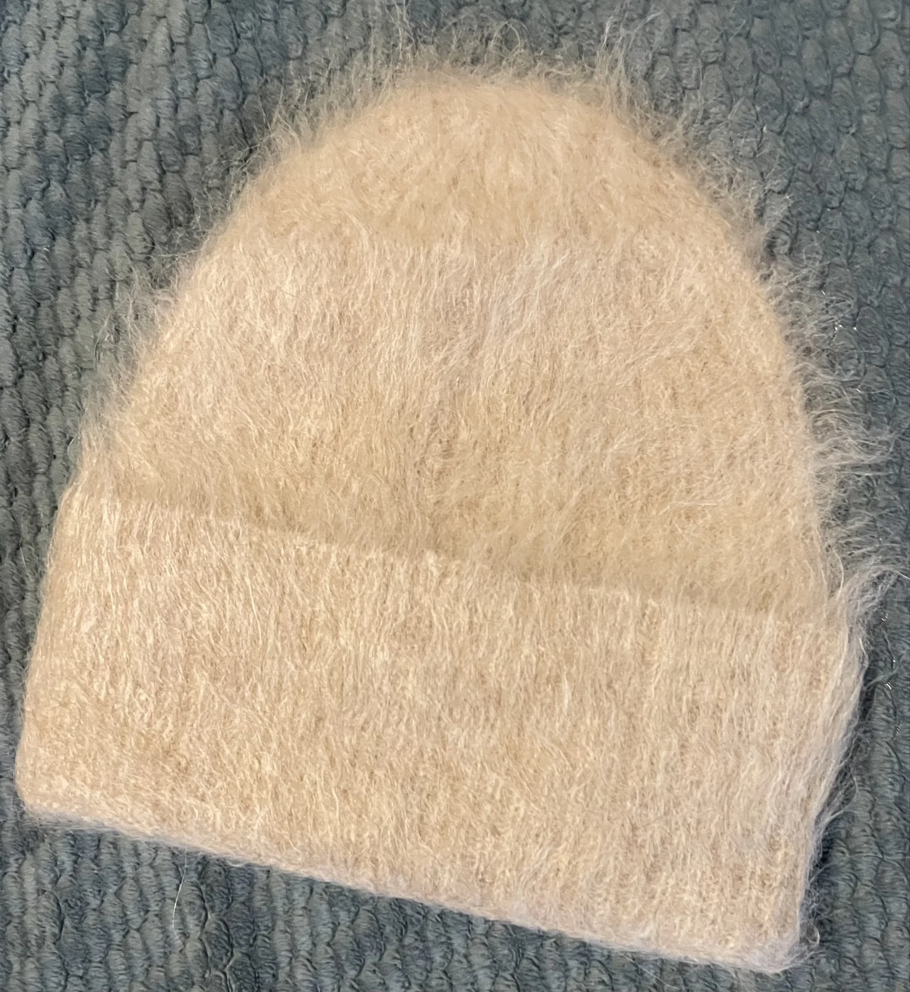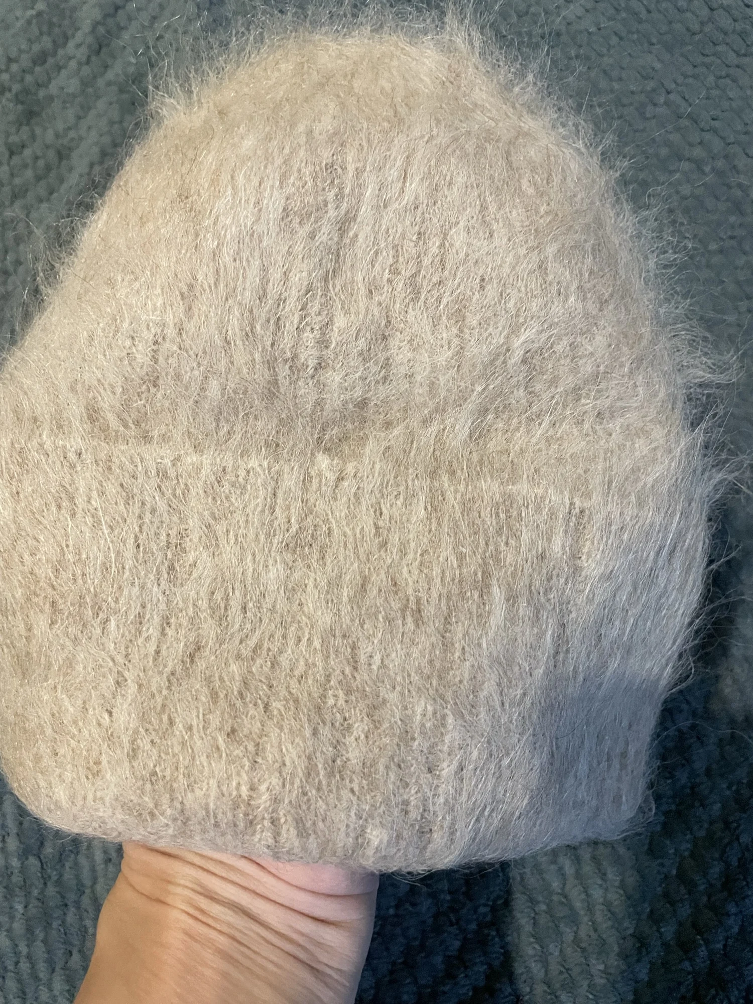 A wonderful hat. I washed it with shampoo, spun it in the centrifuge, and it fluffed up and became super soft. I will order other colors too!