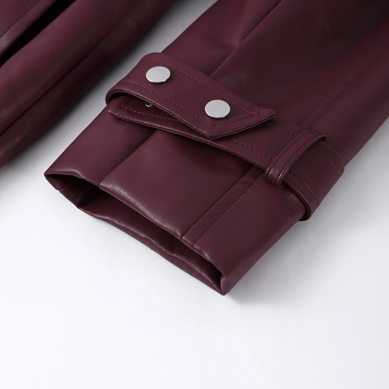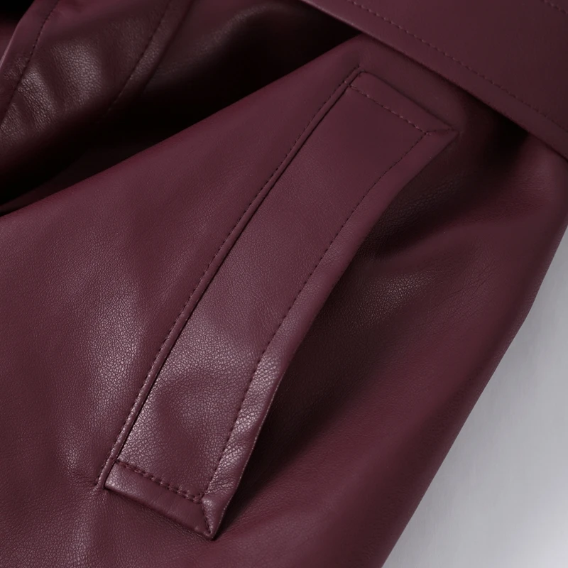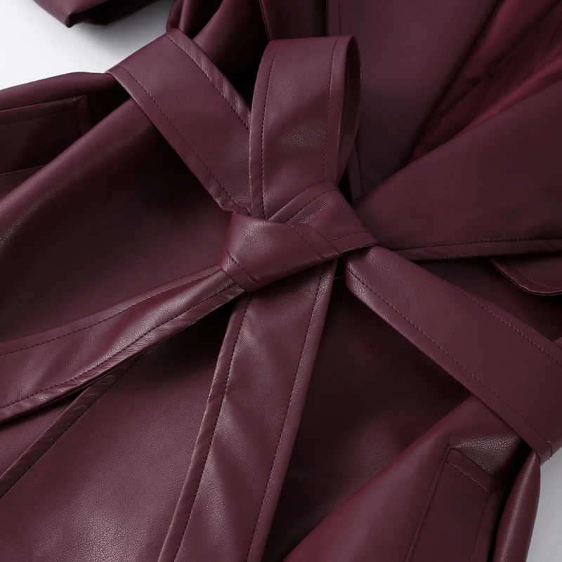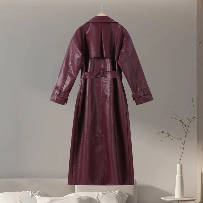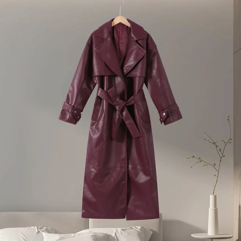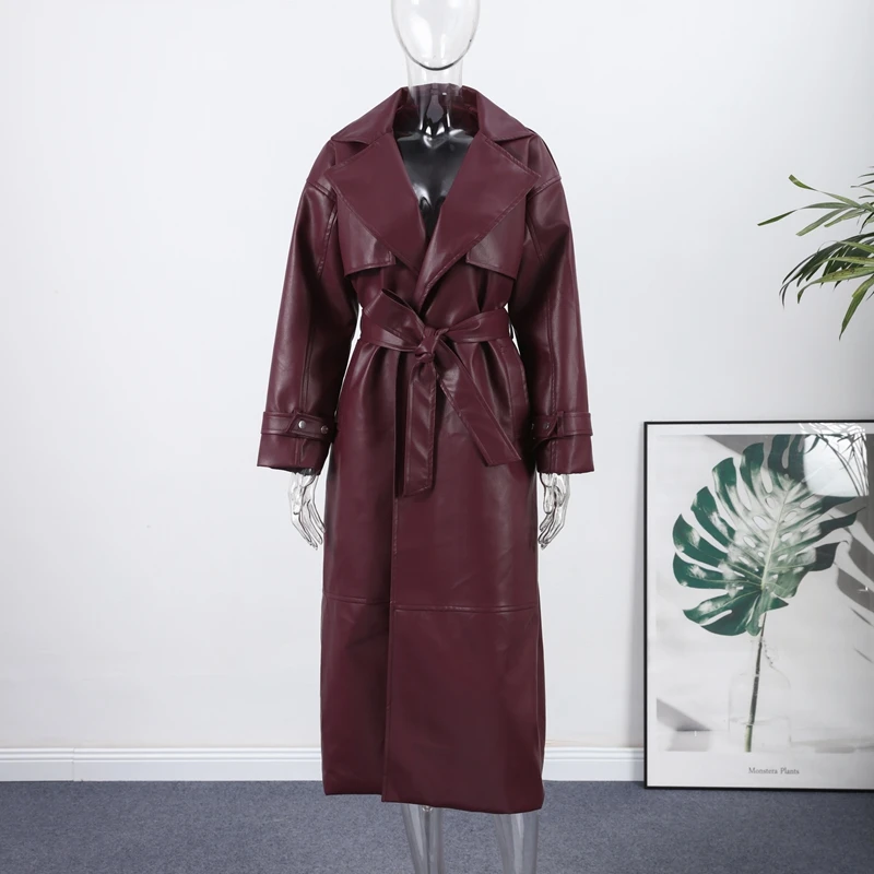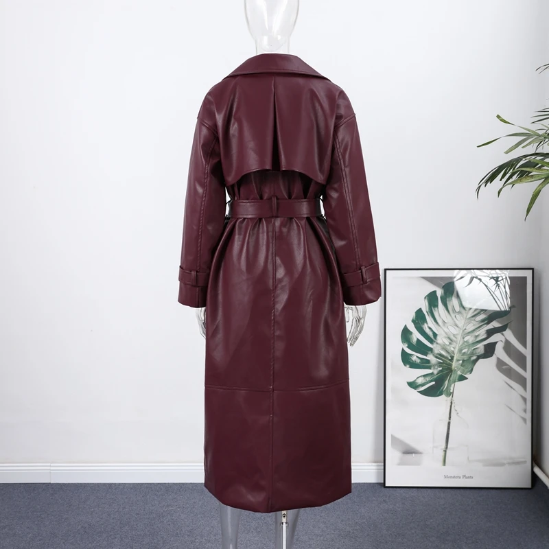 Long belted PU leather trench coat.