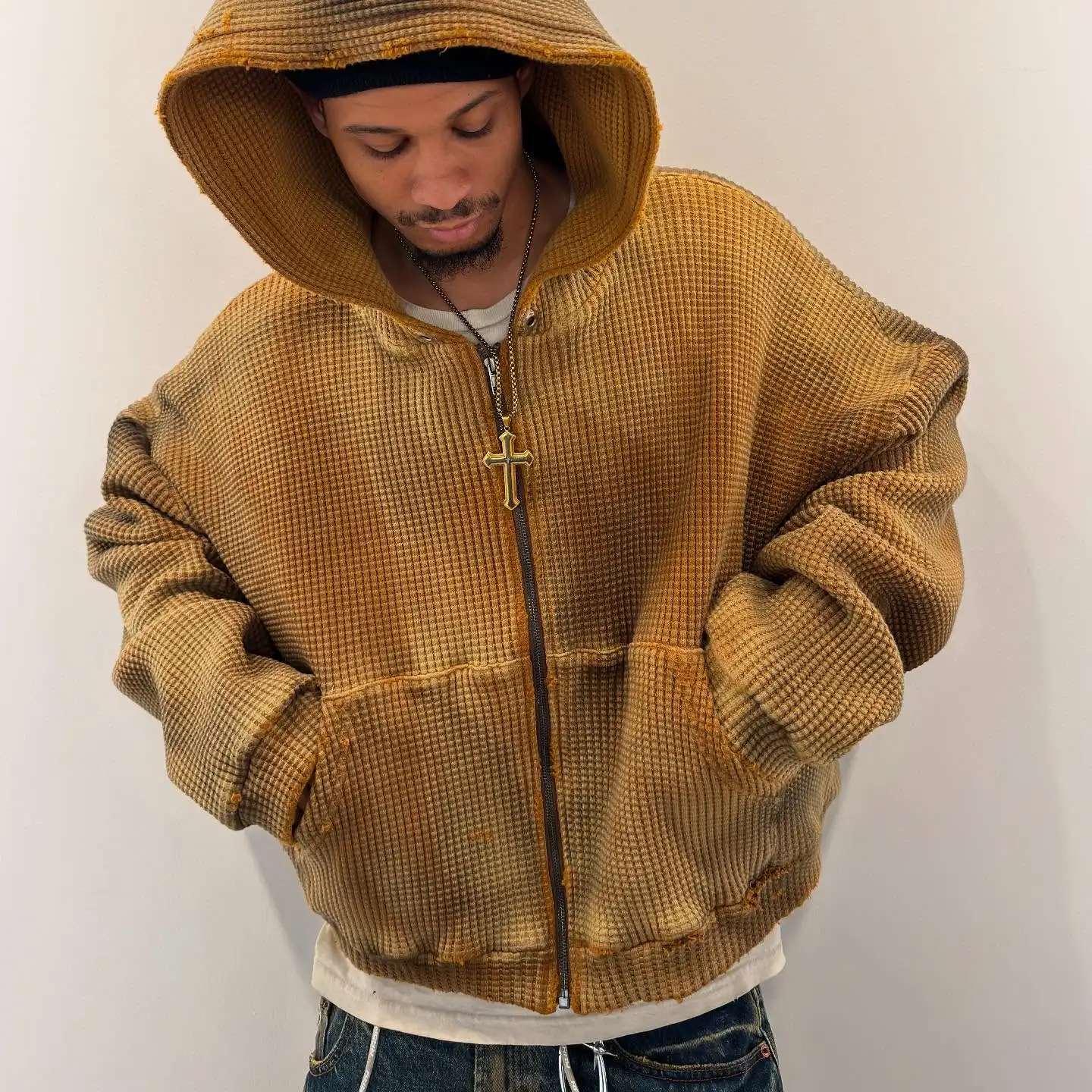 Streetwear knit loose beige hooded jacket.